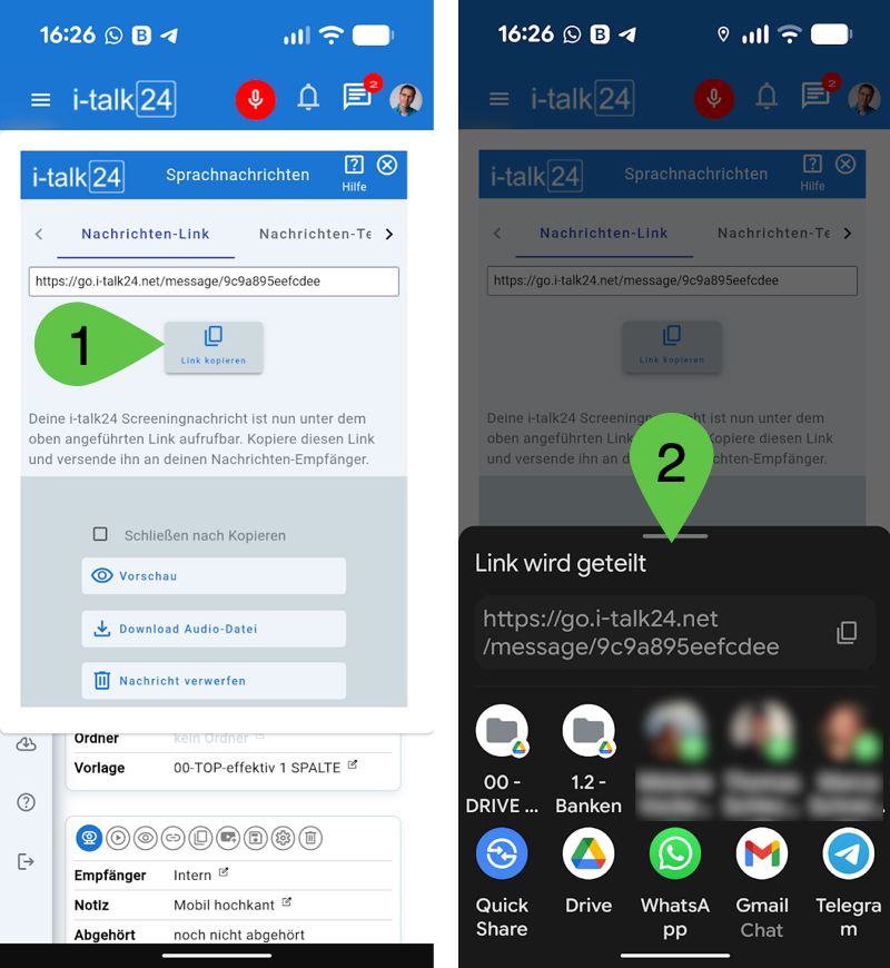 So kannst du mobil den Link zu deiner aufgenommenen Sprachnachricht oder Videonachricht teilen: Klicke nach Abschluss deiner Aufnahme auf den Button zum Erzeugen des Links zu aktuellen Nachricht: Sobald deine Aufnahme fertig hochgeladen ist und der ...