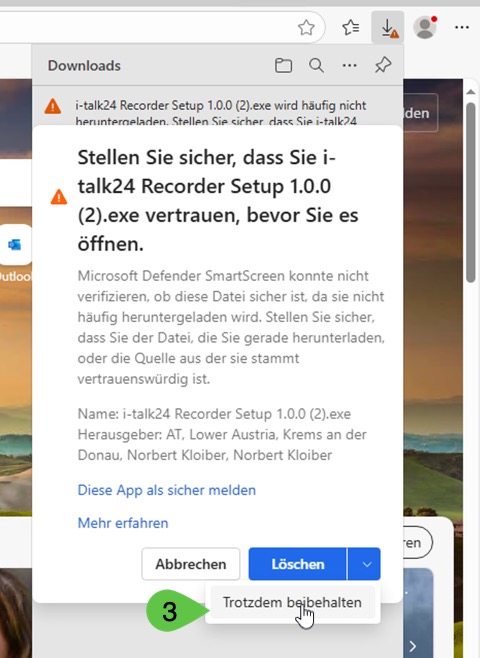 Da unser Setup noch sehr neu ist, kann es teilweise vorkommen, dass dein Browser nach dem Download eine Warnung anzeigt und den Download wieder verwerfen will.